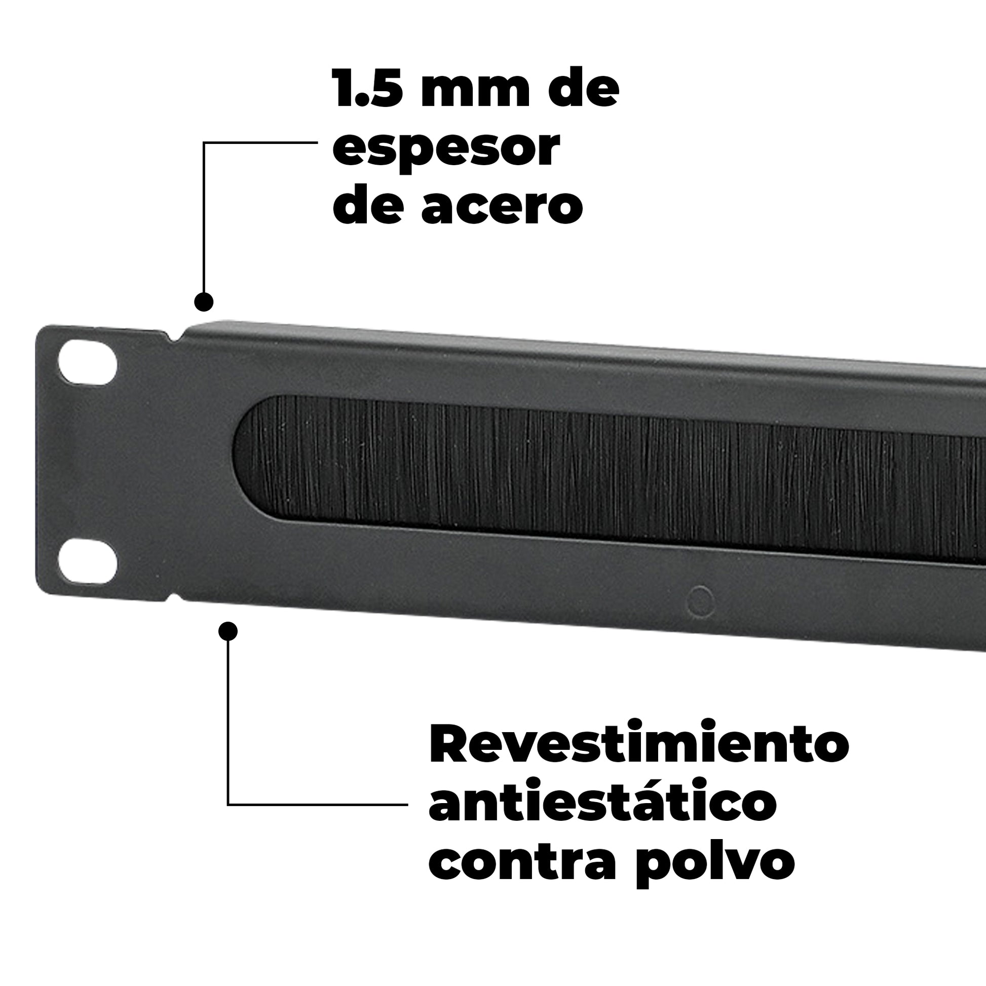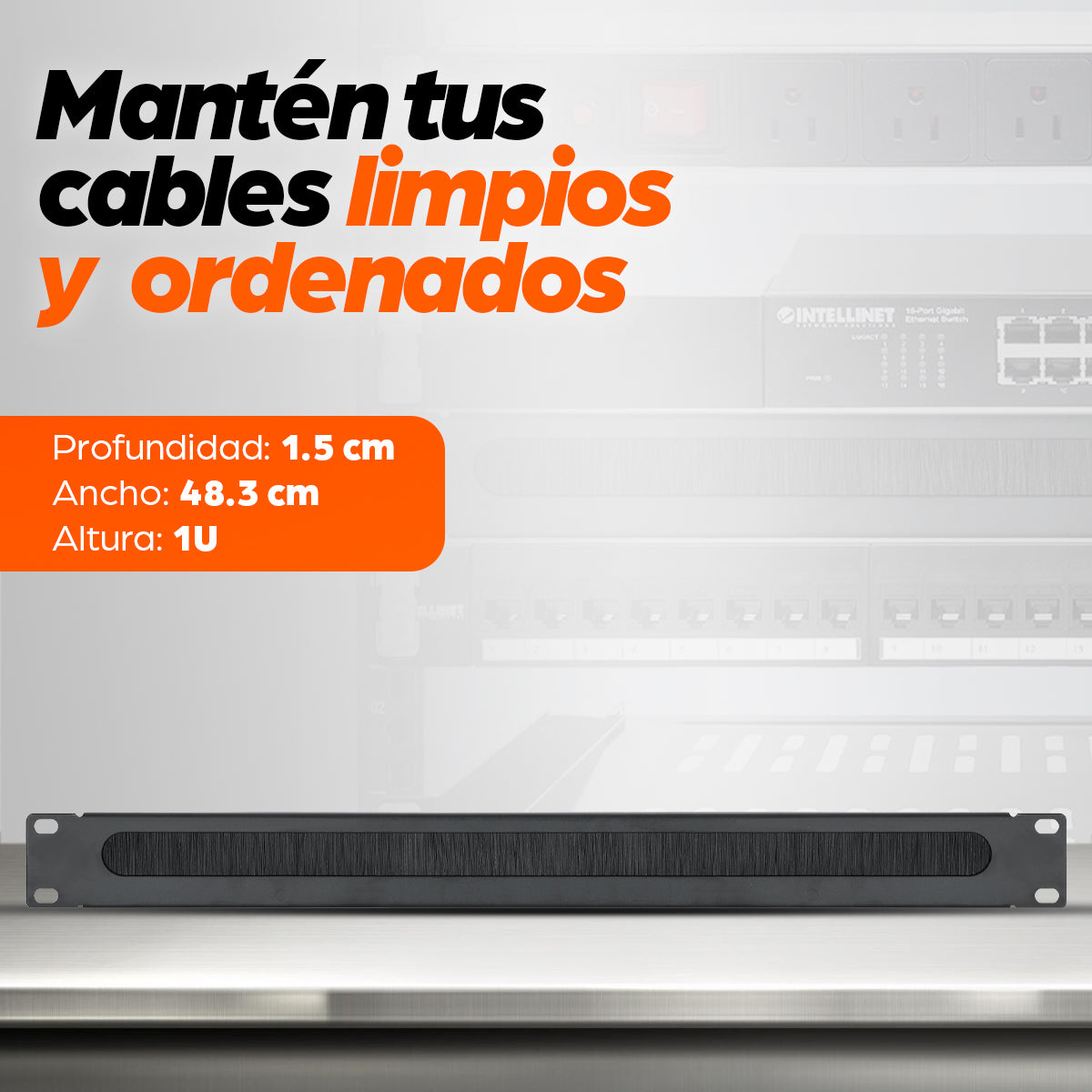 El panel pasacables con cepillo 1U de 19” es la solución ideal para mantener el orden y la seguridad en tus instalaciones de red. Diseñado para racks, gabinetes y servidores, este organizador permite gestionar los cables de manera eficiente, evitando enredos y mejorando la circulación de aire dentro del gabinete.Gracias a su cepillo de alta densidad, podrás pasar los cables de forma uniforme y organizada, además de cubrir cables en pared o canaletas sin comprometer la estética de la instalación.Construido en acero de 1.5 mm con revestimiento antiestático, este panel proporciona protección contra polvo y descargas electrostáticas, cuidando tus equipos de red. Su acabado en color negro RAL9005 le da un estilo profesional y discreto.Con dimensiones de 1U (H) x 483 mm (W) x 15 mm (D) y un peso ligero de 0.2 kg, el panel pasacables es fácil de instalar en cualquier rack de 19” estándar. Además, cuenta con 3 años de garantía que respaldan su calidad y durabilidad.Ideal para administradores de red, técnicos en telecomunicaciones y usuarios que buscan un organizador de cables eficiente, resistente y confiable.